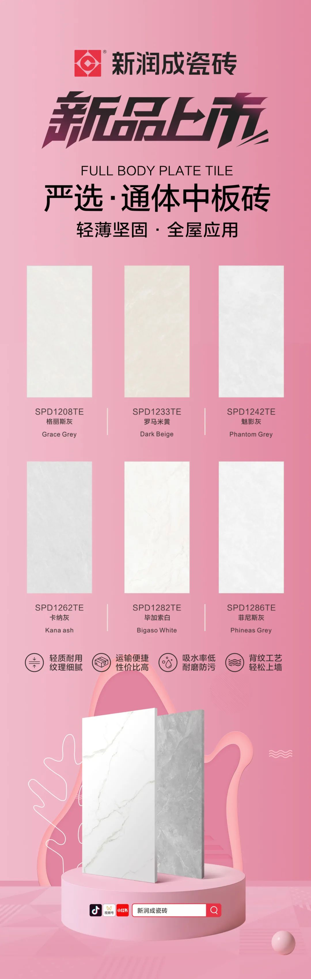 在墙砖大规格化的趋势下,新润成瓷砖加大研发创新的力度。其600x1200mm严选·通体中板系列新品震撼上市,适用于墙面和地面的各种铺贴场景,为消费者带来全新的家居装饰选择。
