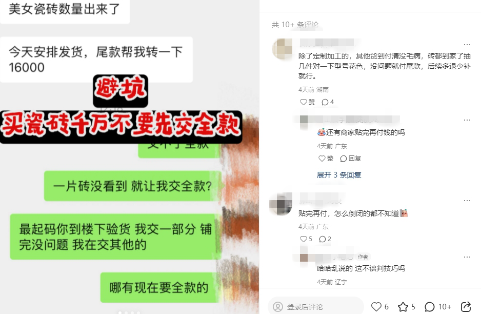 联系建陶行业实际情况,并结合这篇笔记评论区的留言来看,消费者买瓷砖先付定金没有任何争议。