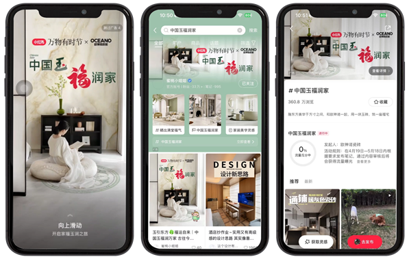 此次欧神诺携手小红书官方打造“中国玉福润家”IP话题,推出活动H5及许愿积分任务玩法,同步上线品专橱窗、开屏广告、火焰话题等资源,最终实现品牌总曝光1.1亿+,品牌话题浏览量589万+,霸榜家装主材-瓷砖类目排名No.1。