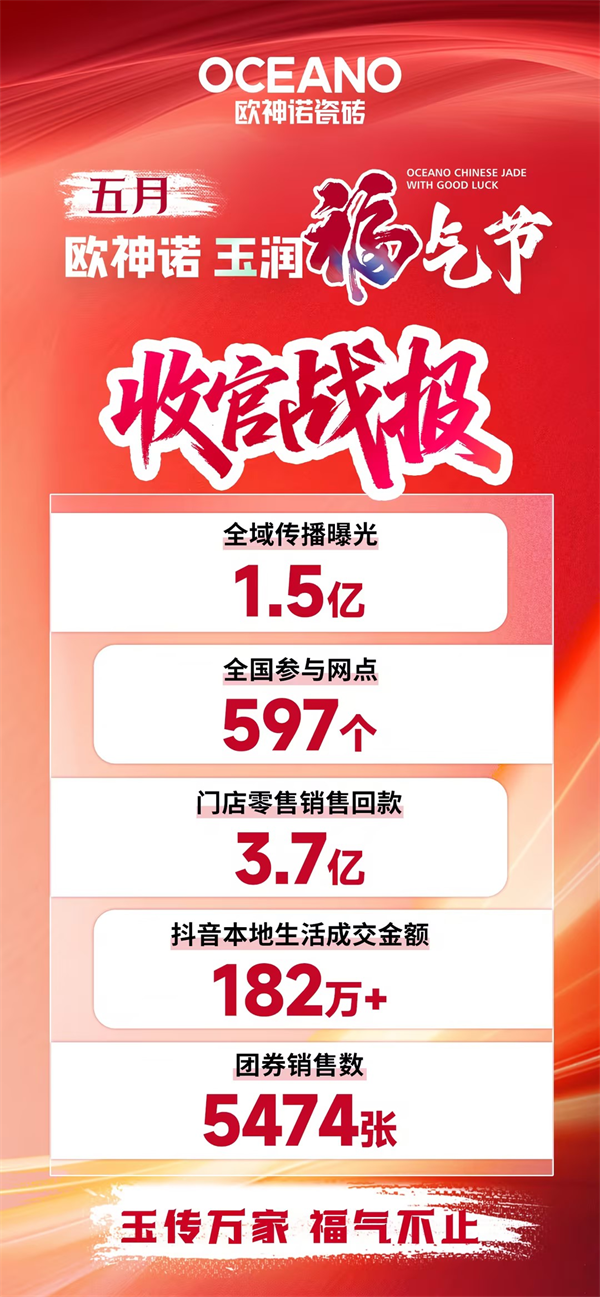 刚刚过去的五月,欧神诺首届品牌节——「玉润福气节」,在全国消费者的热情参与下圆满收官,成为席卷家装界的年度盛事。本次玉润福气节,欧神诺深度布局各大核心平台,以创新内容和精准运营为抓手,全网破圈营销,撬动亿万流量,助力线上线下销售转化,实现品效双丰收,交出了一份令人振奋的成绩单!