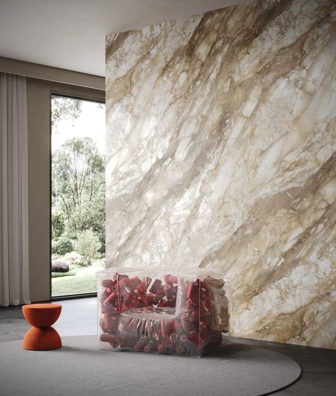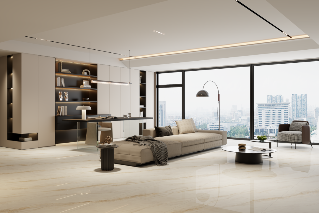 采用柔和的冷色调和微暖的咖色相互融合,强调自然石材的原始质感,复刻天然大理石的裂隙纹理,流畅且灵动。
