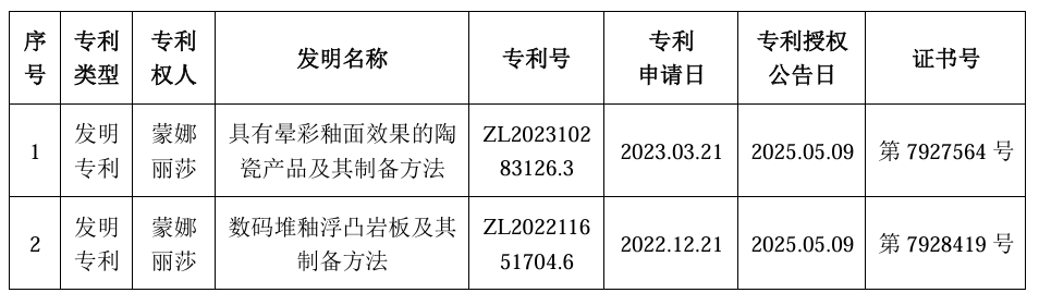 分别为“一种陶瓷薄板铝蜂窝复合板系统及其施工方法”、“一种开槽式陶瓷薄板保温复合板系统及其施工方法”、“具有晕彩釉面效果的陶瓷产品及其制备方法”、“数码堆釉浮凸岩板及其制备方法”等。