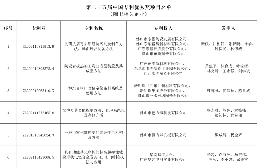 值得一提的是,国家知识产权局于6月5日发布了《关于第二十五届中国专利奖授奖的决定》,东鹏、新明珠、马可波罗、德力泰、恒力泰、华艺卫浴等6家陶卫相关企业,荣获中国专利优秀奖。