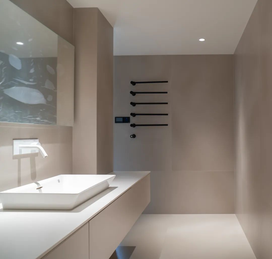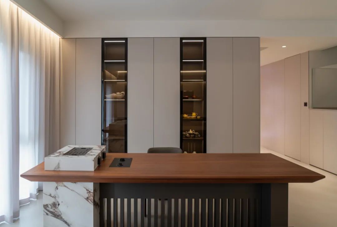 无主灯照明系统通过漫反射原理,在马毛秋木灰瓷砖上流转,光影层次丰富;