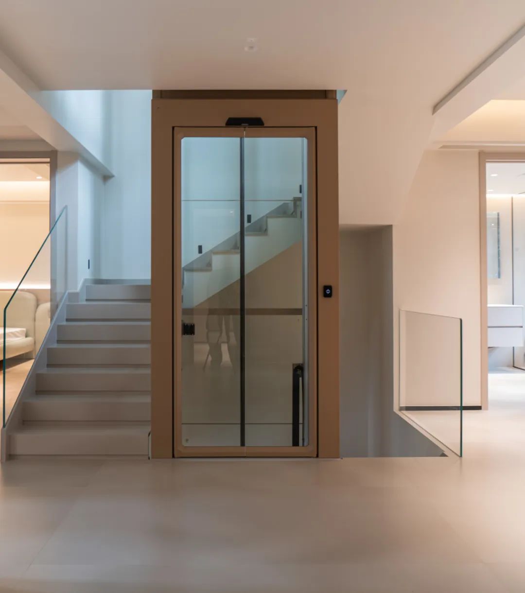家用电梯区域同样以马毛秋木灰瓷砖通铺地面,细腻的质感与整体空间基调自然呼应。