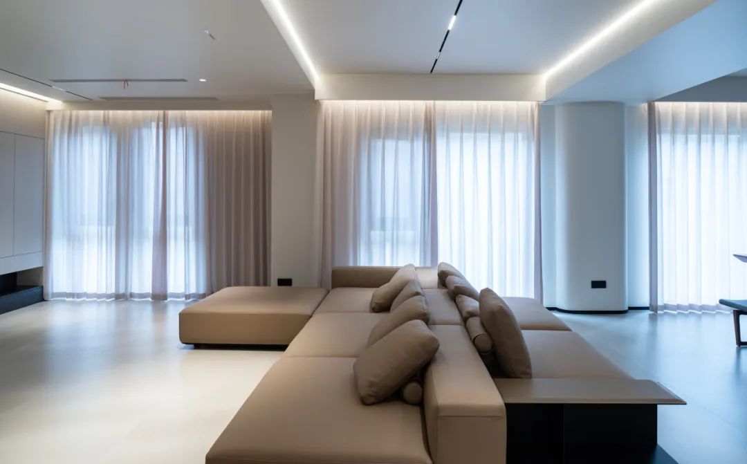 客厅以无界融合的设计手法,构建出极具现代极简主义的生活场域。