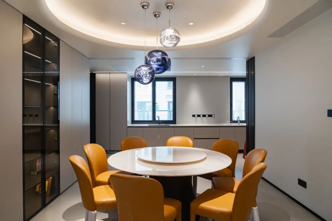 餐厅区域则以大胆的撞色设计成为视觉焦点,白色大理石圆桌纯净优雅,搭配热情洋溢的橙色皮椅,明快的色彩对比带来强烈的视觉冲击,简约中尽显精致。