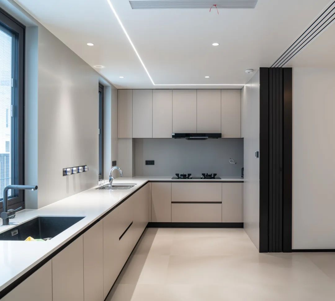 厨房以极简笔触勾勒高级美学,嵌入式蒸烤箱、冰箱与柜体严丝合缝,统一的隐形拉手设计消弭功能设备的突兀感,形成利落连贯的视觉界面;