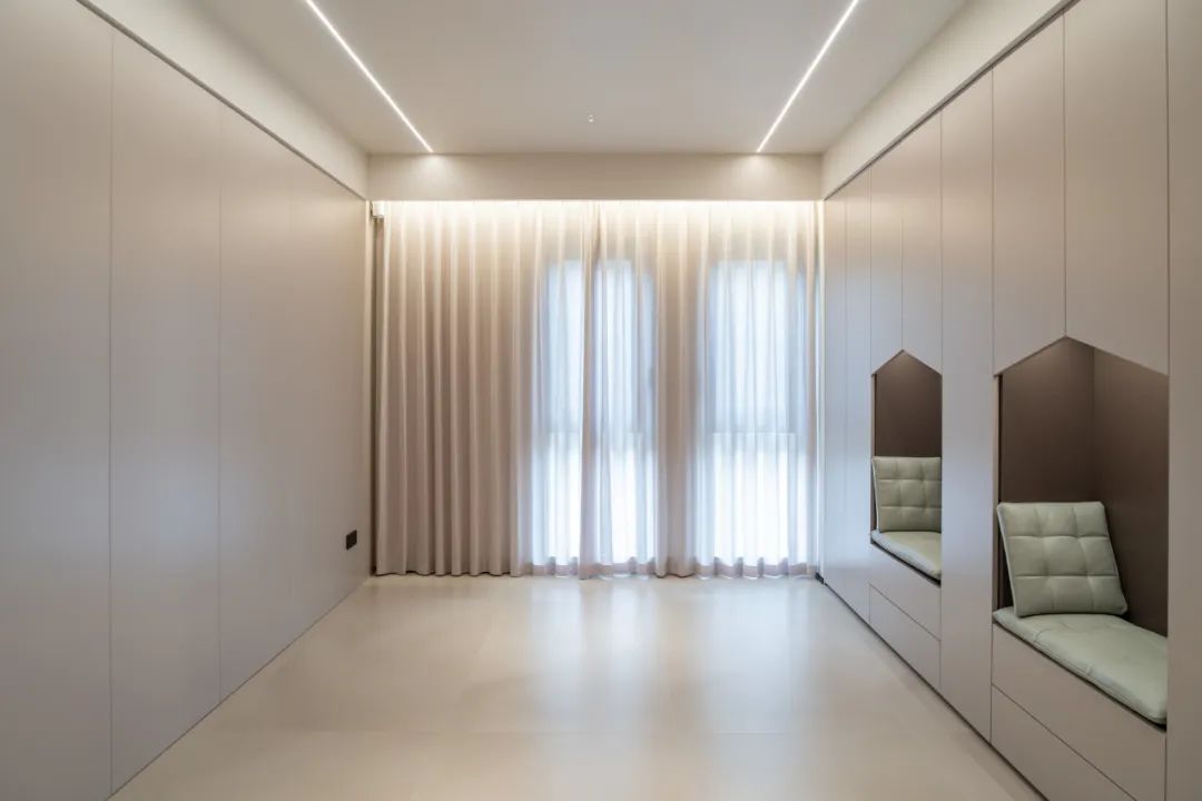 墙面精心设计的壁龛内嵌软包座椅,既提供了休憩之所,又增添了空间的艺术感,打造出一个舒适与美学兼具的静谧空间。