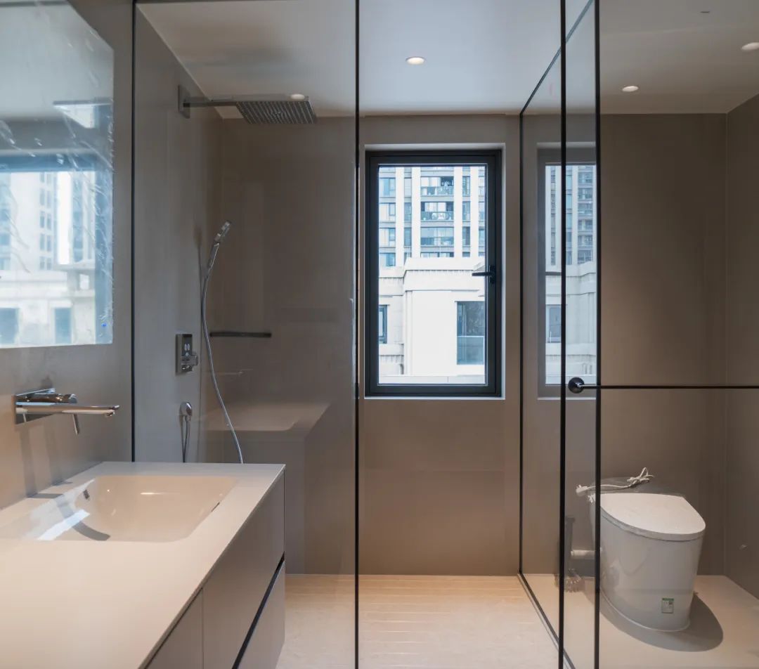 卫生间设计简约而不失格调,秋木灰系瓷砖铺陈,在光影下流转出低调奢华。