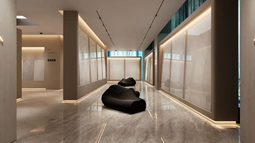 步入三楼,空间化作一曲静谧的材质交响。设计师以极简架构为谱,将产品陈列升华为沉浸式艺术装置。核心展墙由「800×1350mm」规格构建黄金视觉纵轴,显大又显高的尺幅强化空间纵深感,尤其适配现代商品房与高端商业项目。各种规格「超平釉」镜面级通透,演绎极致纯净。地面倒映天光云影,以极致平整诠释二十三年佛山造的匠心。