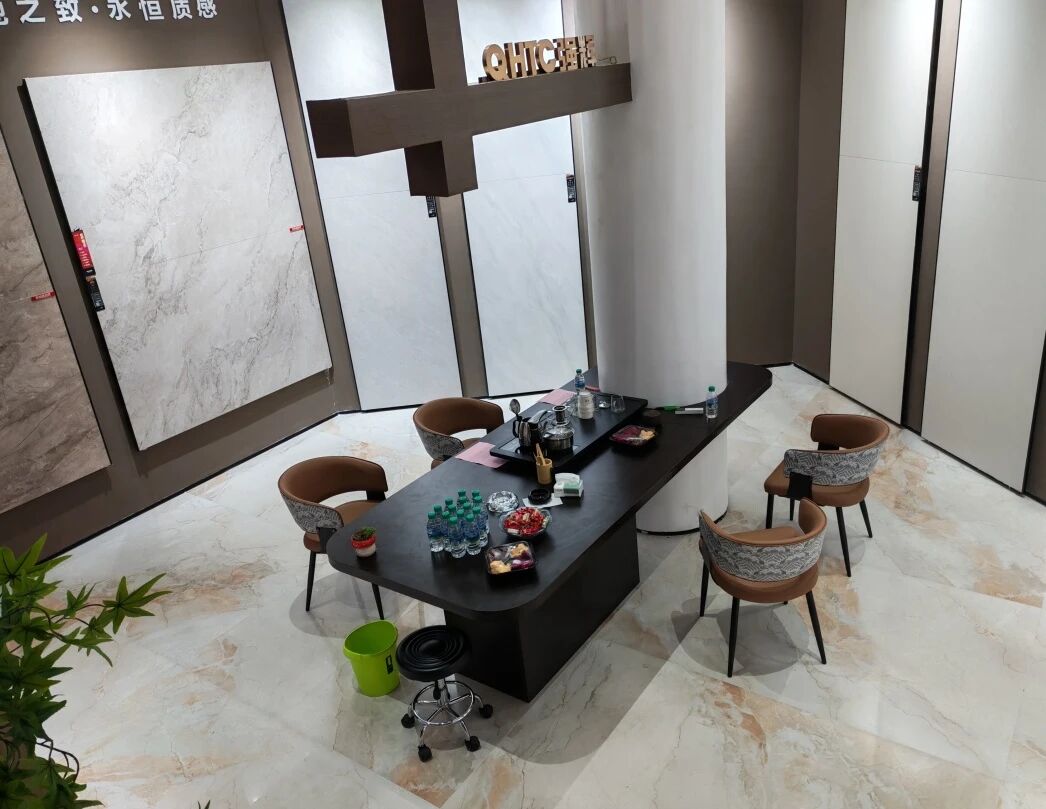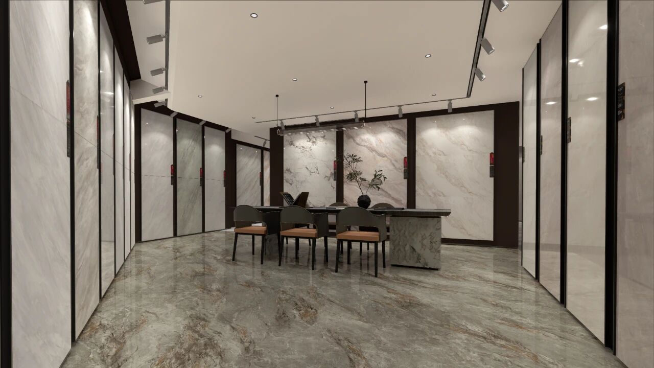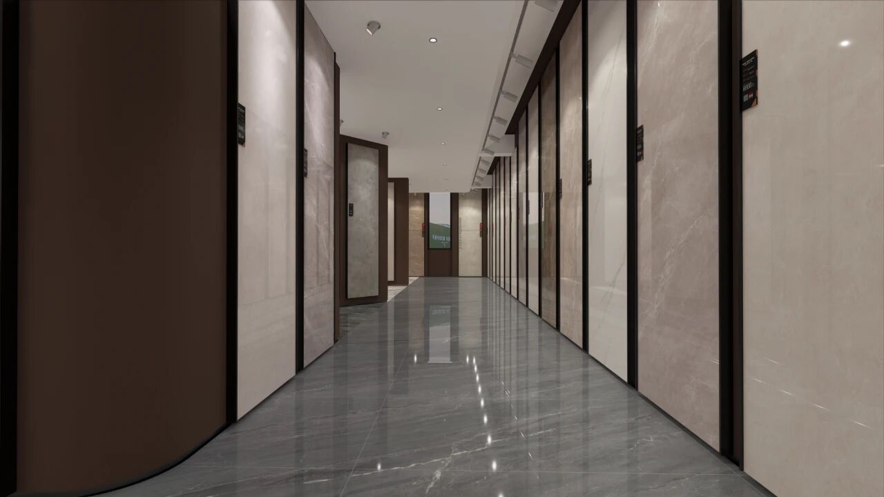 墙面岩板与地面的浅调肌理相互呼应,纹路如山水画卷般舒展,漫步其间,感受自然的诗意。
