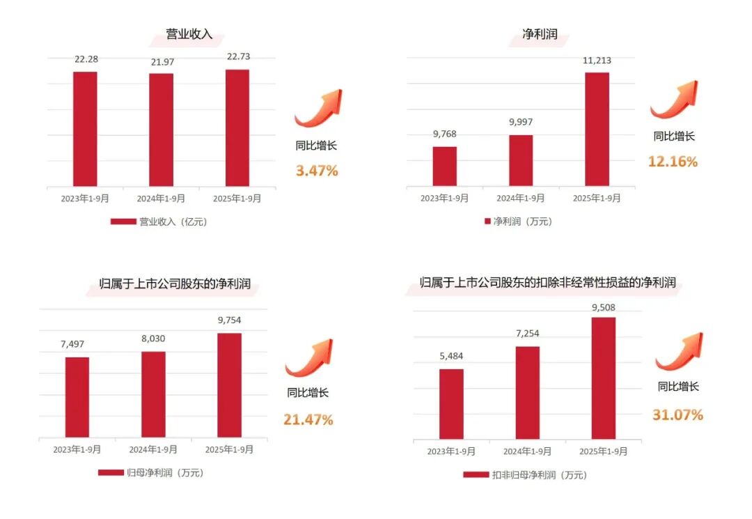 10月16日,鹰牌集团母公司天安新材发布2025年第三季度报告。前三季度公司实现营业收入22.73亿元,同比增长3.47%;归属上市公司股东的净利润9753.97万元,同比增长21.47%;经营活动产生的现金流量净额1.61亿元。